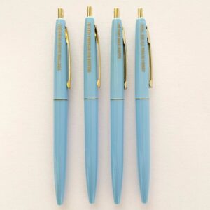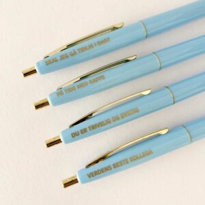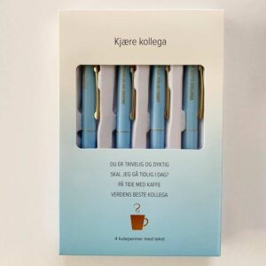 Pakken inneholder 4 kulepenner i blå med tekst.